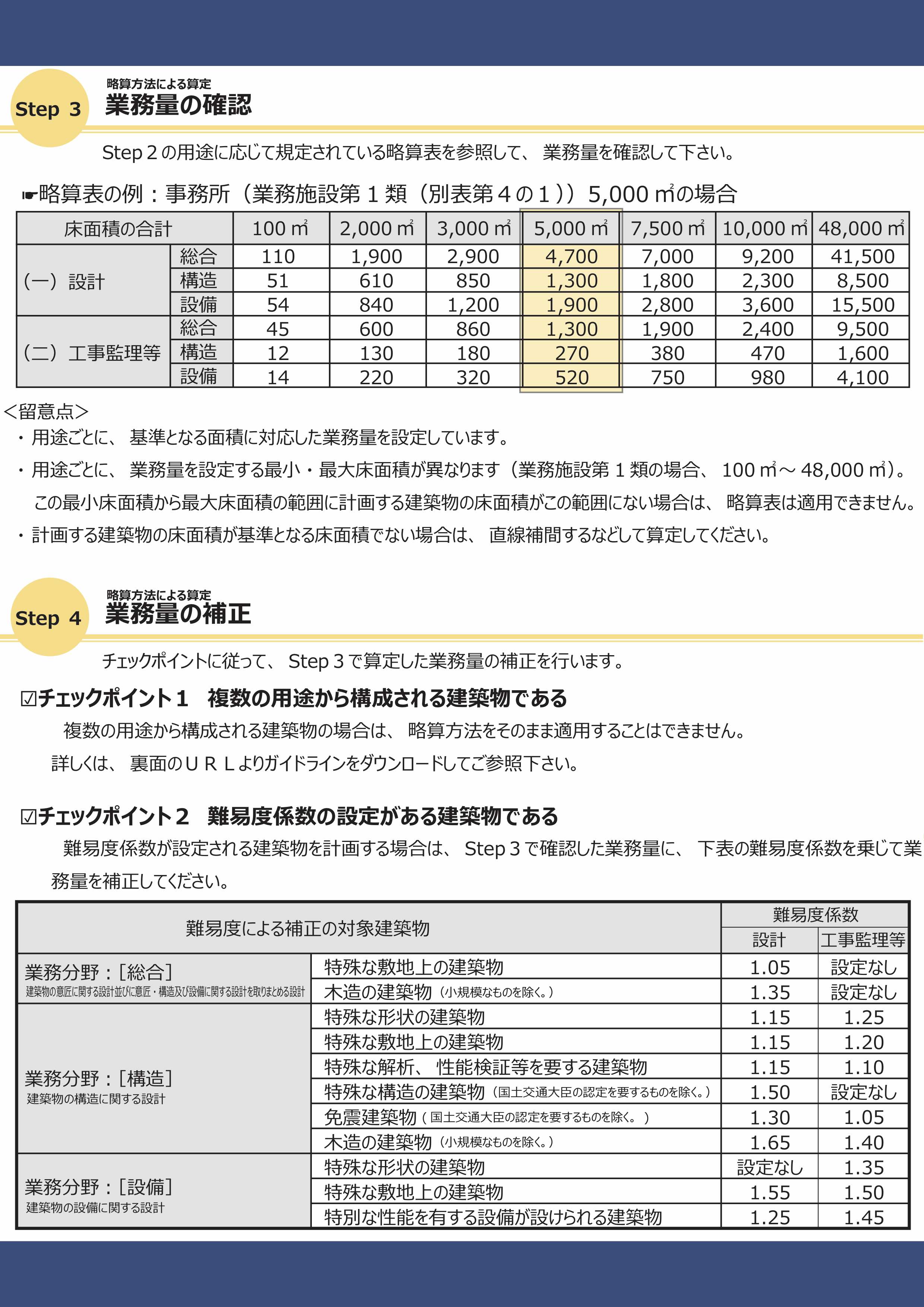 用途や面積による設計料の決め方の手順について、詳細は以下の国土交通省が公開しているパンフレットに掲載されています。