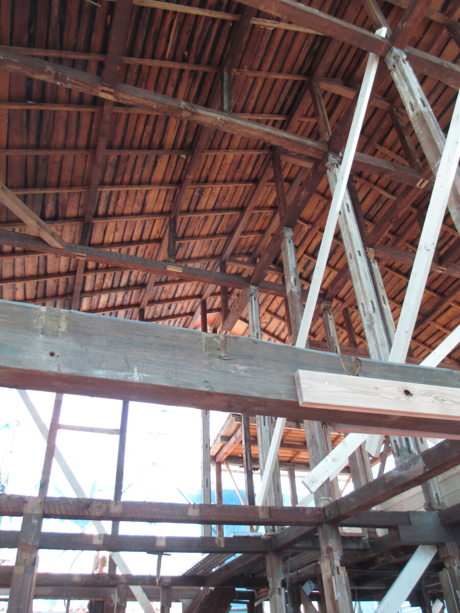 補強工事は、補強設計図をもとに進めます。まずは補強箇所の解体を始めます。実際に既存建物を解体してみたら柱や梁の状態(位置やサイズ、仕口の腐食等)が想定と異なっていた場合には、補強設計を実状に合わせて見直します。