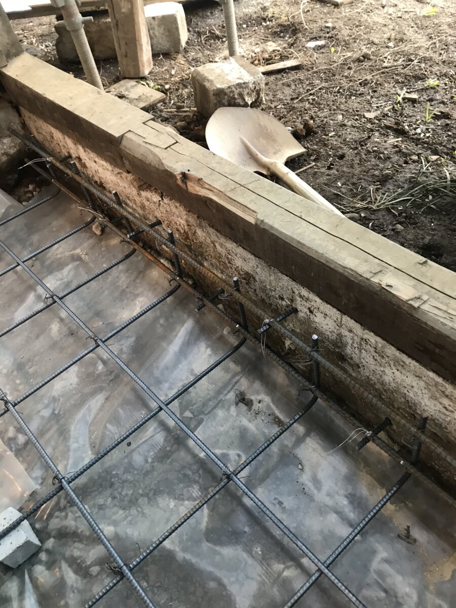 基礎は、上の木造部の補強により基礎にかかる力が既存よりも増えた場合には、緊結金物を取り付けます。緊結金物により大きな力が既存基礎にかかると、破損の可能性がある場合(例えば既存基礎が無筋コンクリートの場合)には、基礎を補強して大きな力に耐えられるようにします。